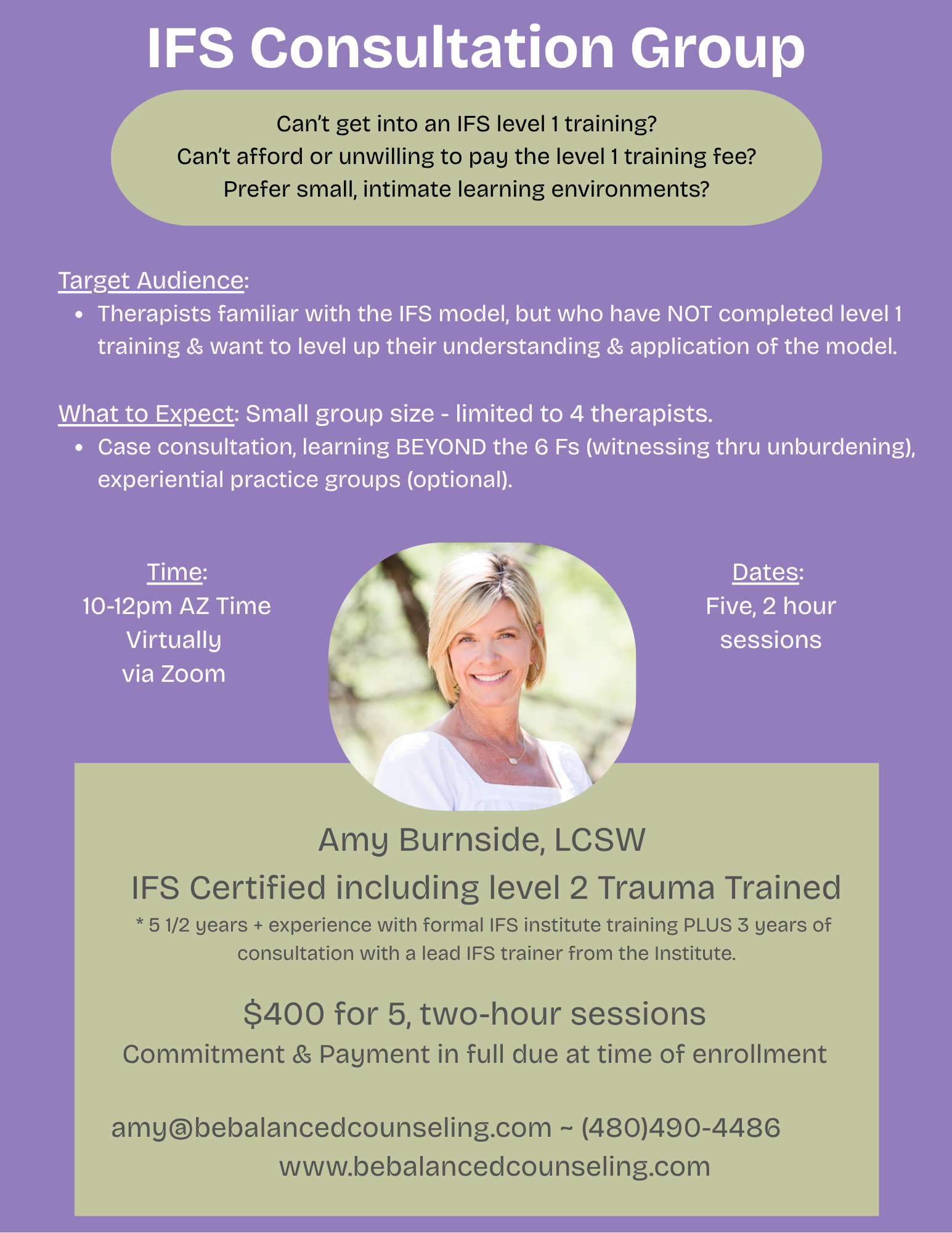 We offer affordable IFS skills building for therapists who want to level up their understanding and application of the model. Group is led by certified IFS and level 2 therapist, Amy Burnside, LCSW.